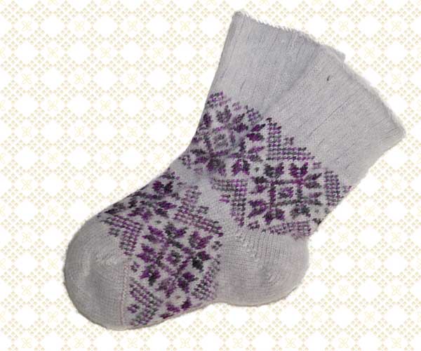 Подростковые шерстяные носки. Цвет:серый. Орнамент:фиолетовый Состав: 100 % шерсть. Размер: длина стопы 22 см.