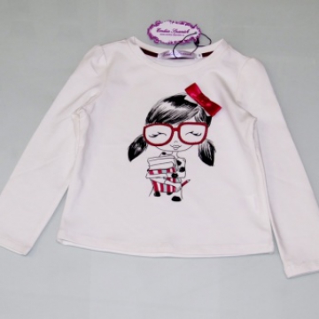Практичная и красивая футболка с длинным руковом и умилительным рисунком. Бант украшенный стразами пришит а стразы на рисунке повторяют контур очков девочки. Ткань плотная, тянущаяся и не сковывает движения.